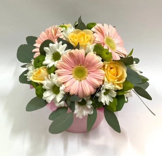 Эта восхитительная композиция в шляпной коробке – настоящий карнавал красок и ароматов. В ней сочетаются нежные герберы, излучающие свою радостную энергию, розы, символизирующие любовь и страсть, а также хризантемы, приносящие в дом уют и умиротворение. Каждый цветок, будто аккорд в гармоничной мелодии, создает удивительное впечатление и захватывает своей красотой. Зелень, украшающая композицию, словно танцует вокруг цветов, придавая им особую изящность и свежесть. Шляпная коробка, олицетворяющая элегантность и изысканность, подчеркивает утонченность этой композиции.